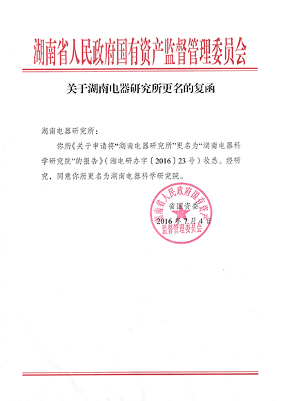 湖南電器研究所經(jīng)國(guó)資委批復(fù)于2016年12月1日更名為湖南電器科學(xué)研究院
